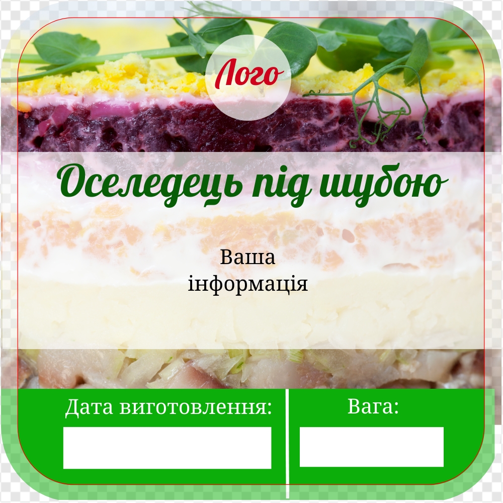 Наклейка предназначена для упаковки овощных салатов, идеально подходит для того, чтобы привлечь внимание покупателей к вашему продукту. Салаты на тарелках выглядят свежими и аппетитными, а дизайн с натуральными силуэтами овощей и желтыми полосами добавляет дополнительный шарм.