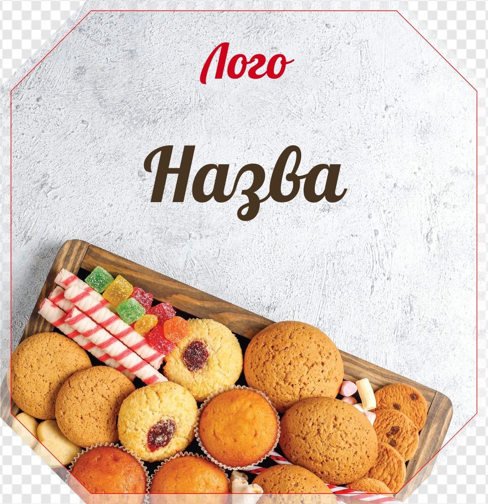 Шаблон наклейки на упаковку для печива на білому тлі з жовтим елементом у центрі, де зображено шоколадне печиво. Дизайн яскравий та привабливий, допомагає продукту виділитися на полицях.