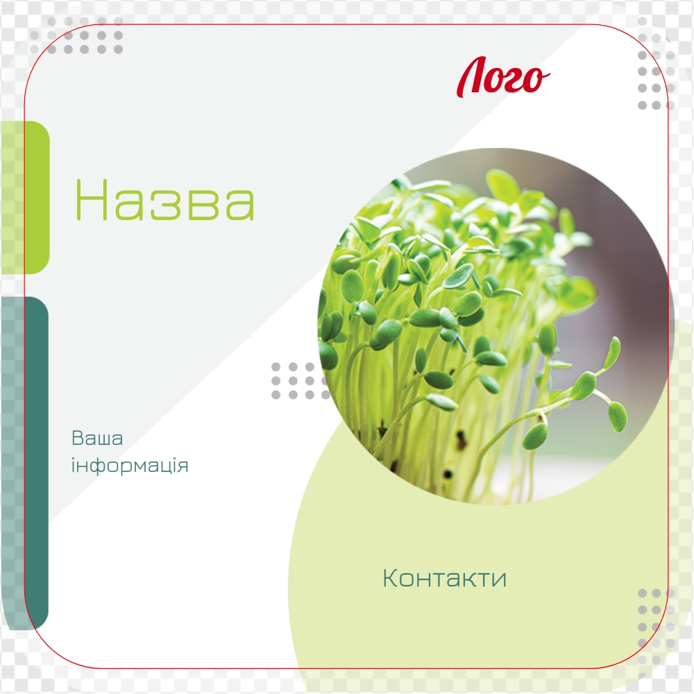 Шаблон наклейки для пакування мікрозелені. На білому тлі зображено кошик з мікрогрином, який приверне увагу покупців до вашого товару. Наклейка легко приклеюється на будь-яку поверхню та зберігає яскравість кольорів.