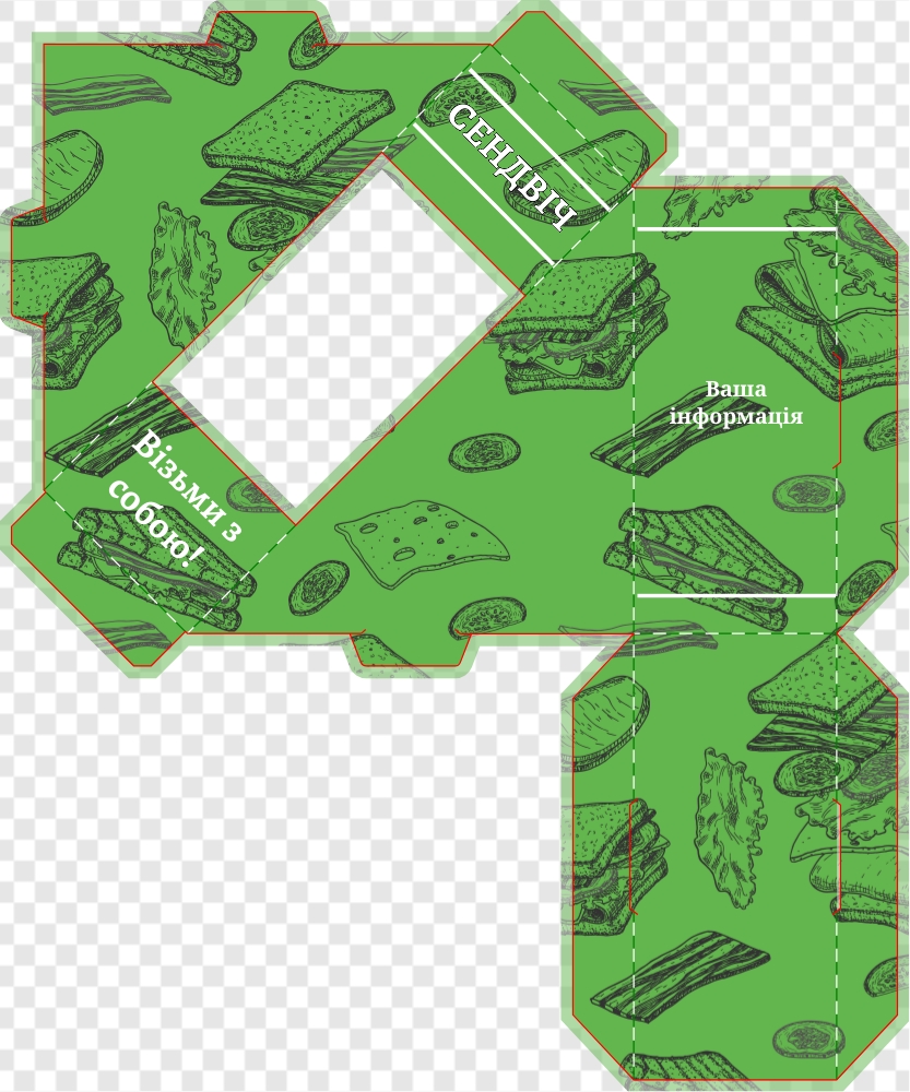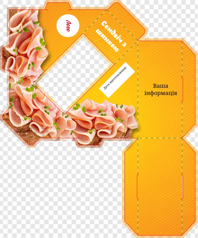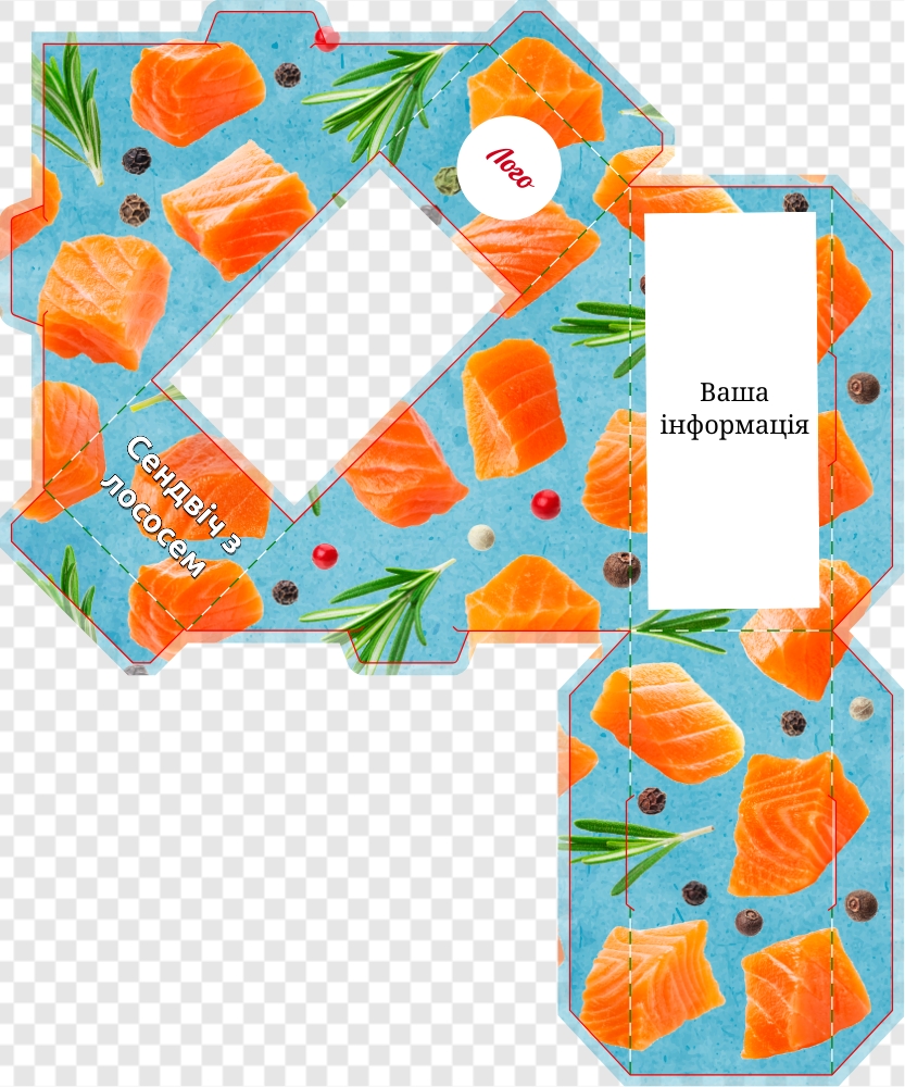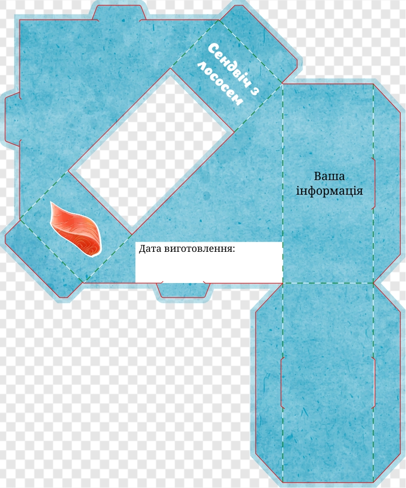 Шаблон упаковки сендвіча з тунцем на блакитному тлі. На передній грані розташована назва "Сендвіч. Тунець" та зображення бутерброда з тунцем. На бокових гранях зображення бутерброда з тунцем, а на задній грані на білому тлі інформація про продукт.