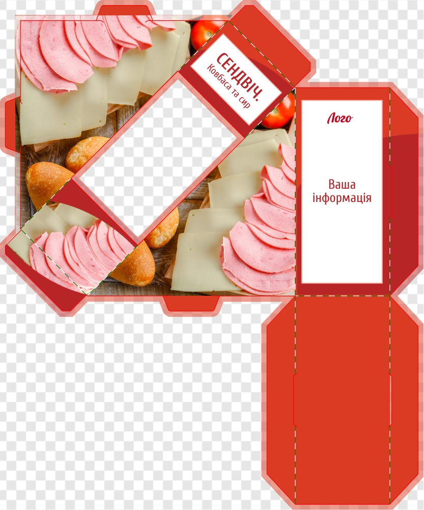 Даний шаблон упаковки для сендвіча має яскраве жовте тло, на передній грані якого розташовується назва "Сендвіч з куркою" та зображення курки по нижній частині вздовж усієї упаковки. На задній грані упаковки представлена інформація про продукт, а на бічних гранях можна вказати дату виготовлення та розмістити логотип.