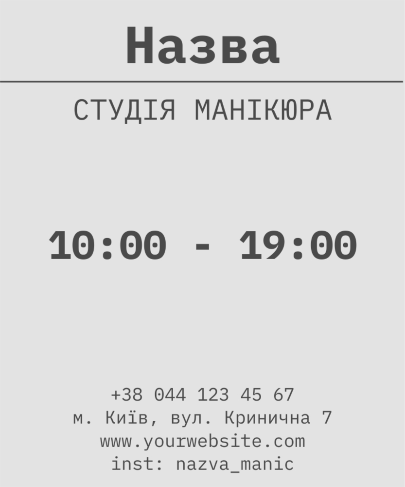 Шаблон наклейки на двері пропонує всі необхідні елементи для ефективного оформлення дверей вашої студії. Прямокутна наклейка має дві зелені рамки із закругленими кутами. У верхній рамці виділяється ваш логотип, поруч із ним розміщено назву. Годинник роботи виділений спеціальним зображенням годинника та зеленими лініями, щоб привернути увагу. У нижньому прямокутнику вказаний номер телефону та посилання на ваш профіль у Instagram. Цей шаблон дозволить вам не тільки представити свою студію професійно, але й забезпечити зручний доступ до контактних даних та інформації про години роботи.